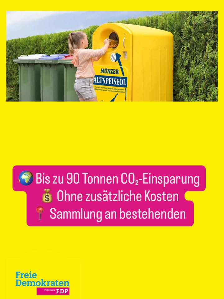 ♻️ Gute Idee. Guter Beschluss. Gutes Klima. Der Rat der Stadt Plettenberg hat am 04.11.2025 einstimmig unserem FDP-Antrag zur Altspeisefettsammlung zugestimmt 🙌 ➡️ Altes Speisefett wird künftig zu Biodiesel 🌍 Bis zu 90 Tonnen CO₂-Einsparung 💰 Ohne zusätzliche Kosten 📍 Sammlung an bestehenden Containerstandorten So geht pragmatischer Klimaschutz vor Ort – einfach, sinnvoll und umsetzbar 💛 #fdp #plettenberg #klimaschutz #kommunalpolitik
