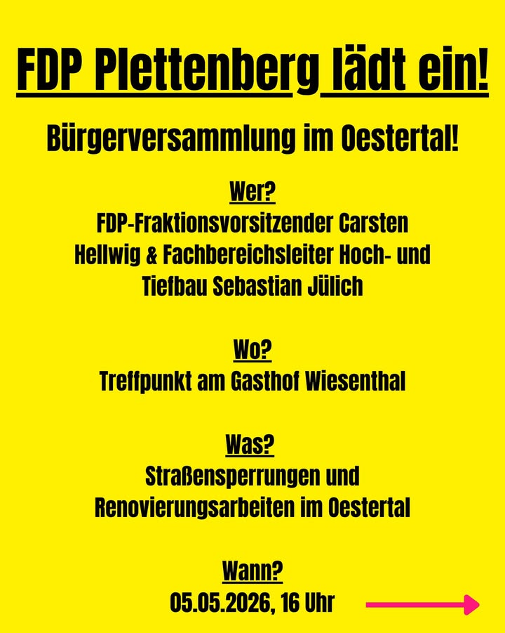 🚧 4 Wochen oder doch 4 Monate? 🤯 Im Oestertal stehen große Veränderungen an, aber was genau ist eigentlich geplant? Und warum dauert die Straßensperrung plötzlich deutlich länger als ursprünglich angekündigt? 👀 Wir wollen Klarheit schaffen, Fragen stellen und gemeinsam ins Gespräch kommen. 💬 Seien Sie dabei, wenn die Pläne vorgestellt werden und wir direkt vor Ort diskutieren, was das für Sie bedeutet! 📍Kommen Sie vorbei, informieren Sie sich aus erster Hand und bringen Sie Ihre Fragen mit! #Plettenberg #Oestertal #Bürgerdialog #FDP #vorortfürdich